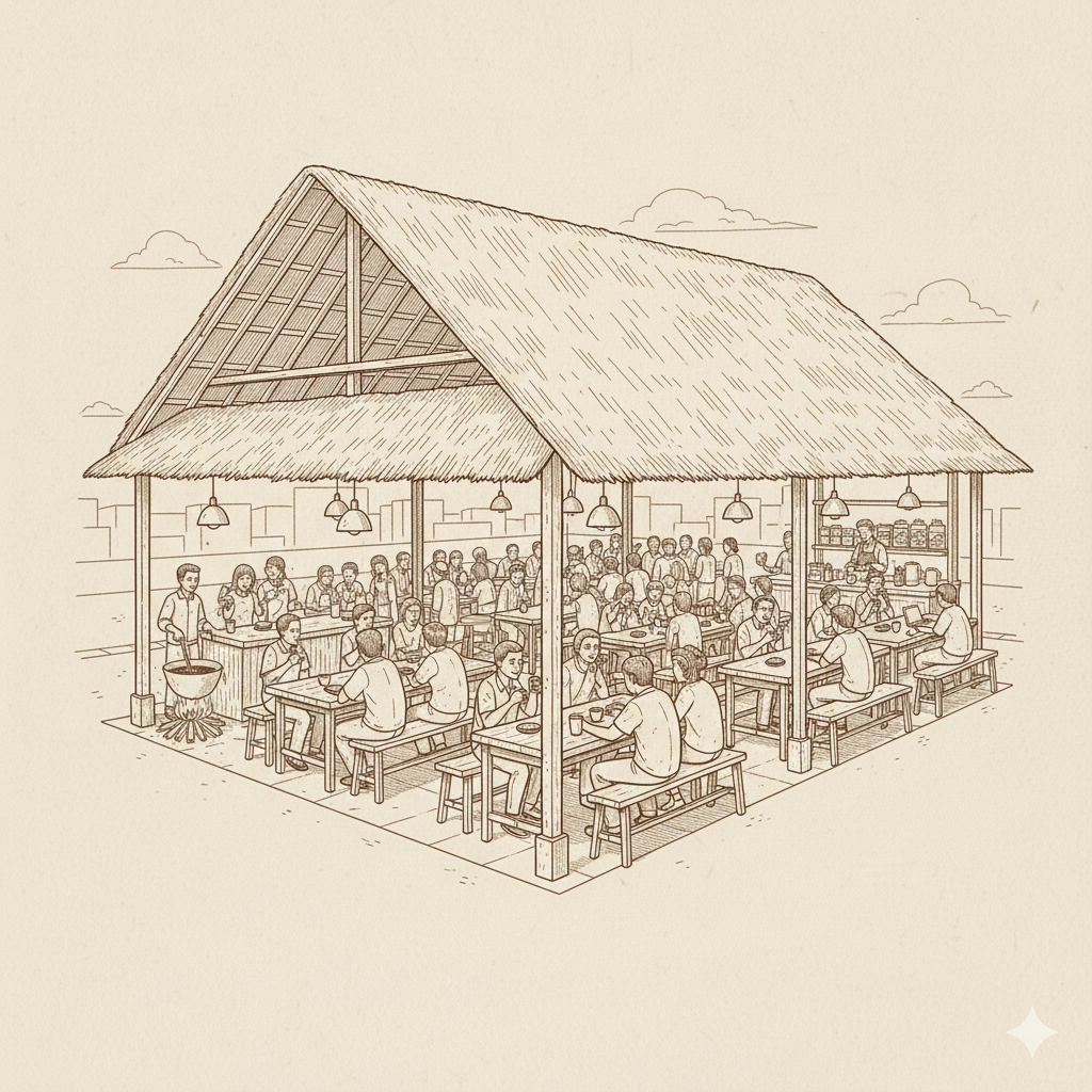 - Dekat jalan besar, pemukiman, dan area kerja → warung kopi besar.