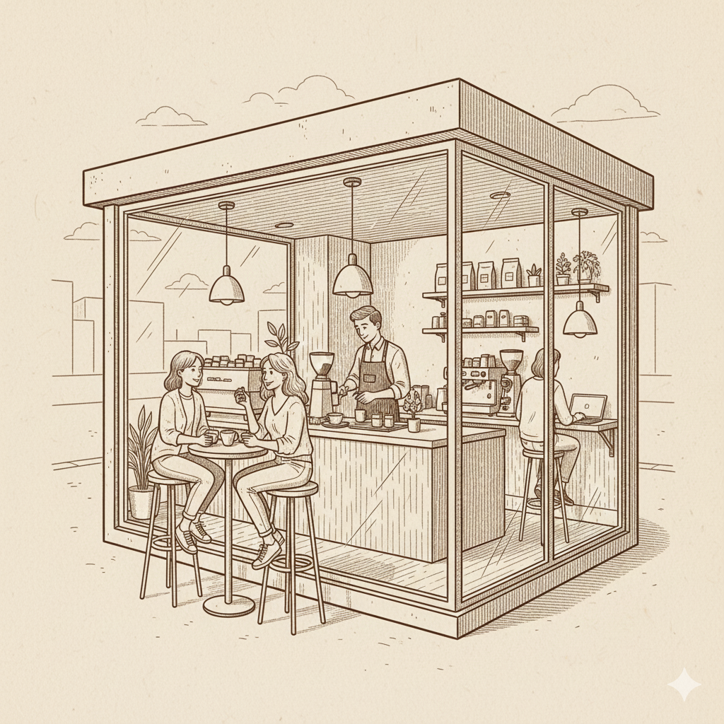 - Di dalam kota, ruko kecil, dekat kampus, atau area kreatif → kafe kecil.