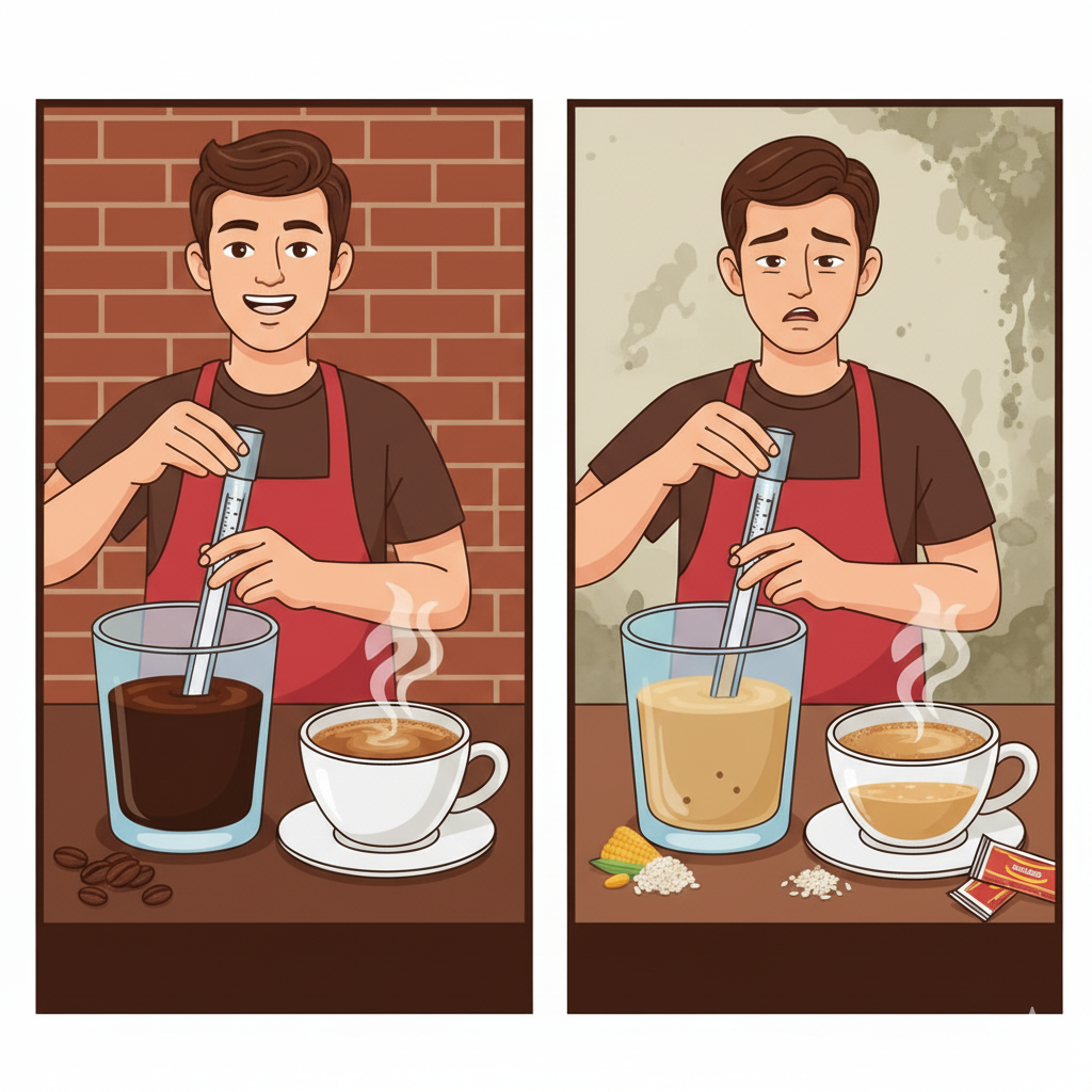 Nah bisa jadi itu karena kopi yang kamu beli bukan berasal dari kopi murni 100%, alias sudah dicampur dengan bahan lain seperti jagung, beras, atau bahkan gula dan perisa buatan. Dan masalahnya, banyak orang yang nggak sadar kalau kopi yang mereka minum itu bukan 100% kopi, apalagi kalau beli kopinya di pasaran dengan harga super murah.