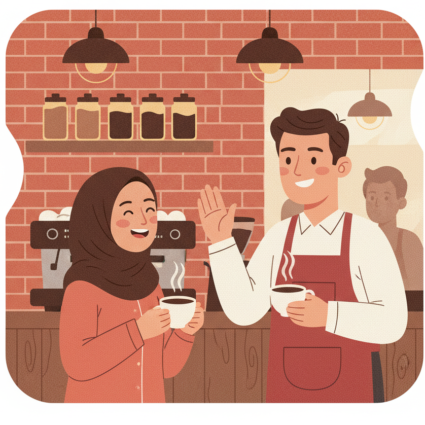 Untuk menghidupkan tempat yang nyaman ini bisa kamu mulai dengan sapaan-sapaan kecil ke pelanggan yang datang ke warung kopimu, misalnya seperti: